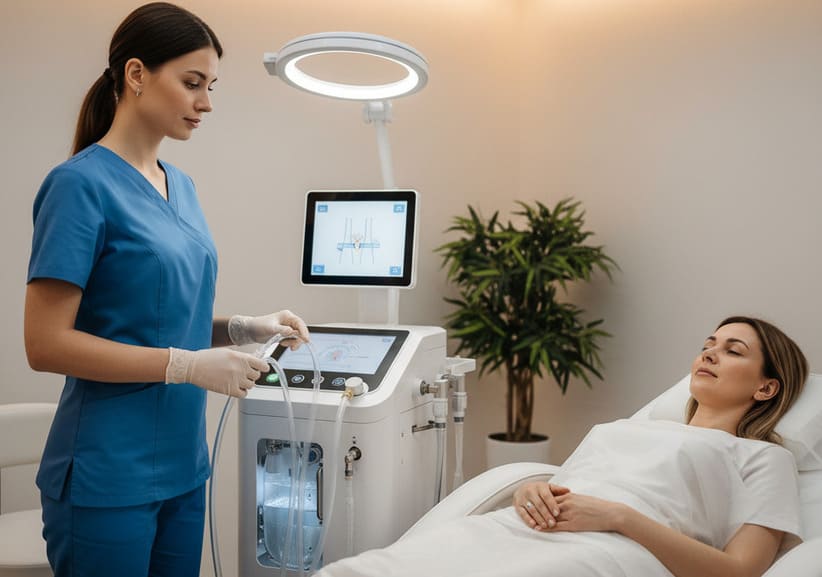 Questa tecnica sostituisce interamente la preparazione tradizionale con lassativi e viene eseguita direttamente il giorno dell’esame. Si tratta di una procedura semplice, veloce e indolore, svolta con una specifica apparecchiatura che permette di lavare il colon in modo controllato. Il paziente viene posizionato sul fianco o supino e nel retto viene inserita una cannula composta da due tubi: uno più piccolo per l’ingresso dell’acqua e uno più grande per l’evacuazione dell’acqua e del materiale fecale. Il sistema è a circuito chiuso, quindi non vi sono odori sgradevoli e tutto avviene in modo igienico e discreto.